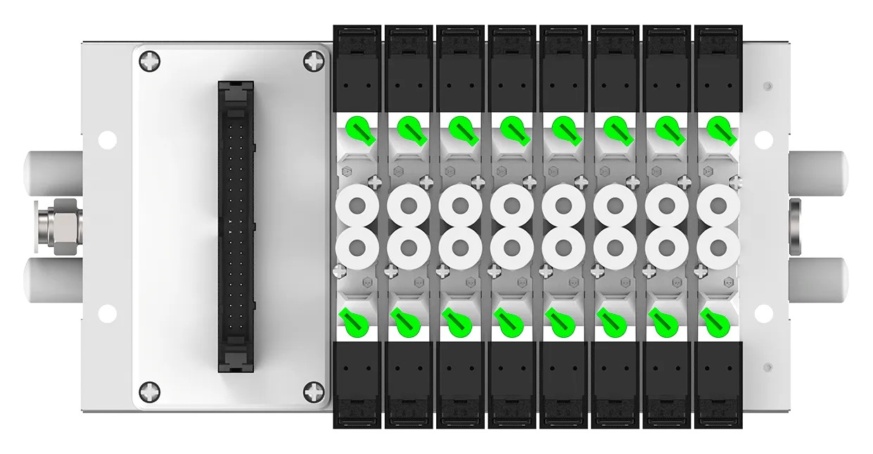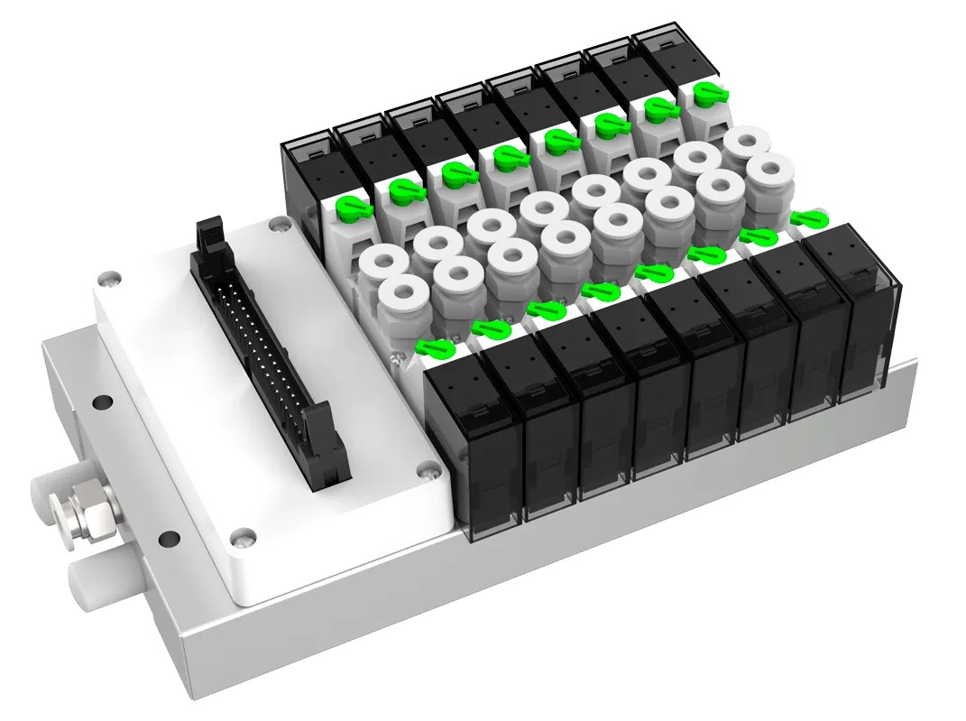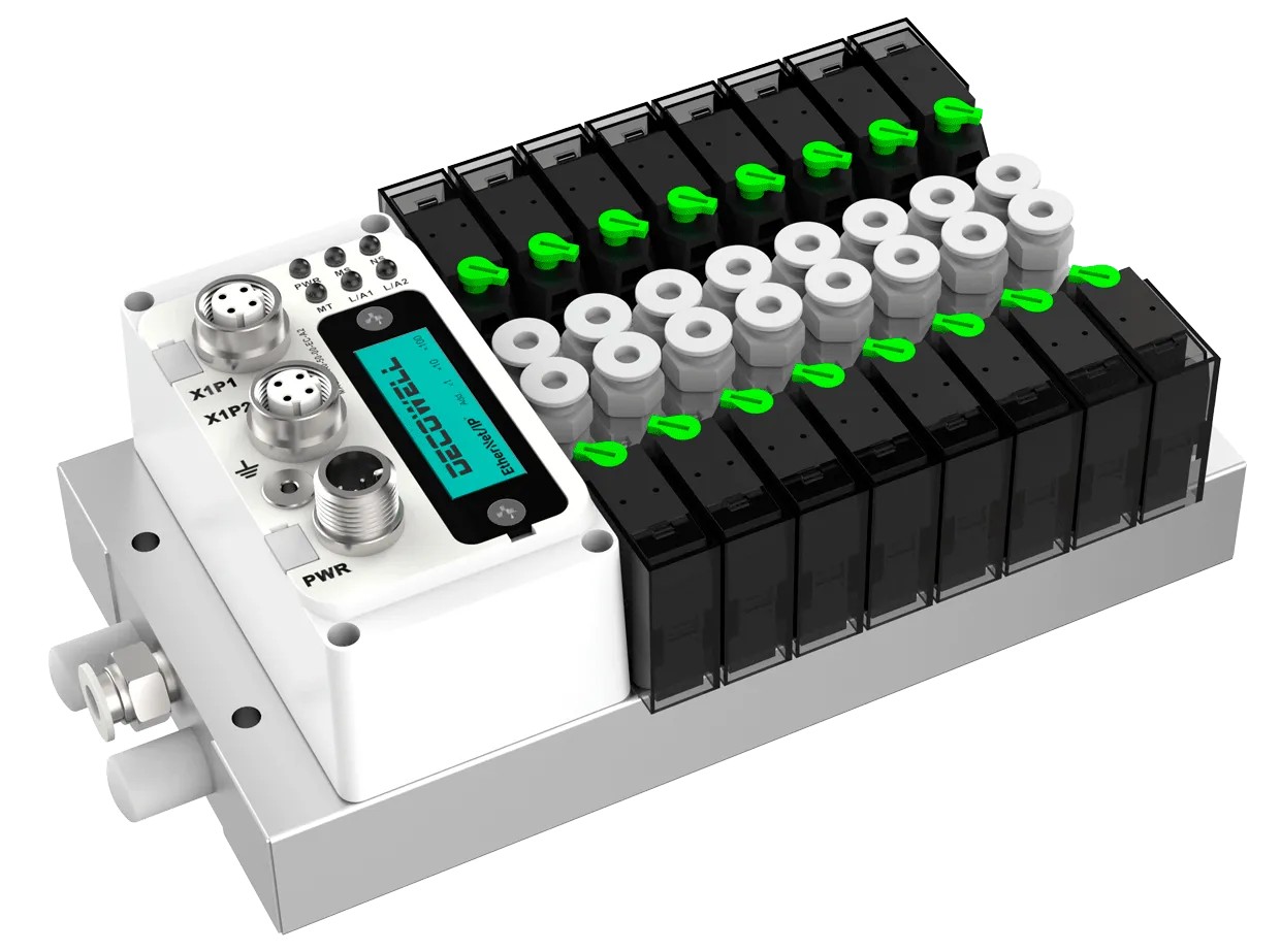 EV 系列总线阀岛基于我司现有阀岛技术进行全面优化, 采用适 配器与汇流板组合设计, 结构简洁紧凑。阀岛的电磁阀采用下叉 式设计,安装和更换更加快捷、可靠,满足高效作业需求。支持主 流总线协议,包括 PROFINET、EtherCAT 和 EtherNet/IP,兼容 多种品牌设备。电源与通讯接口均采用 M12 连接,简化接入过程, 保障电源和通讯的稳定性与高效性。该阀岛广泛应用于自动化控 制领域,为客户提供优质的性能保障与操作便捷性。